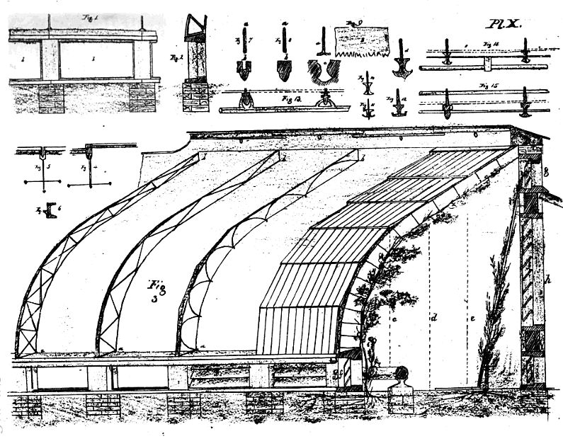 Other glasshouses with Loudon connections include Bicton Park near Exmouth in Devon, which looks remarkably like the designs in Remarks on the Construction of Hothouses shown above. Probably built in the early 1820s the enormous dome is unsupported and the structure is held together by simple pressure and Loudon’s glazing bar. There is an interesting commentary on Bicton by Candida Lycett Green at: