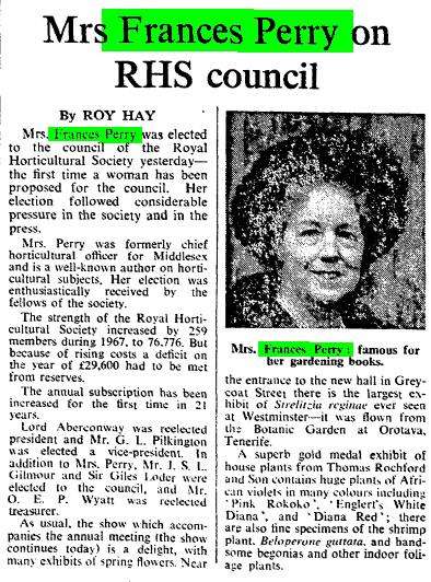 “Mrs Frances Perry on RHS council.” Times [London, England] 21 Feb. 1968: 12. The Times Digital Archive