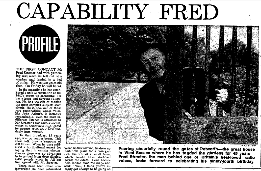 The Observer profiled Fred Streeter on his 95th birthday in June 1971. The article by John Heilpern explained how Streeter had established a unique reputation as a gardening broadcaster: “He has the gift of making the most complex subjects seem simple…and he is one of those rare personalities whose voice.. is instantly recognisable: even the most indifferent listener is attracted to Mr Streeter’s rich Sussex accent.” It also helped that Streeter was head gardener at Petworth House, working on the estate that Capability Brown had transformed two centuries or so earlier.