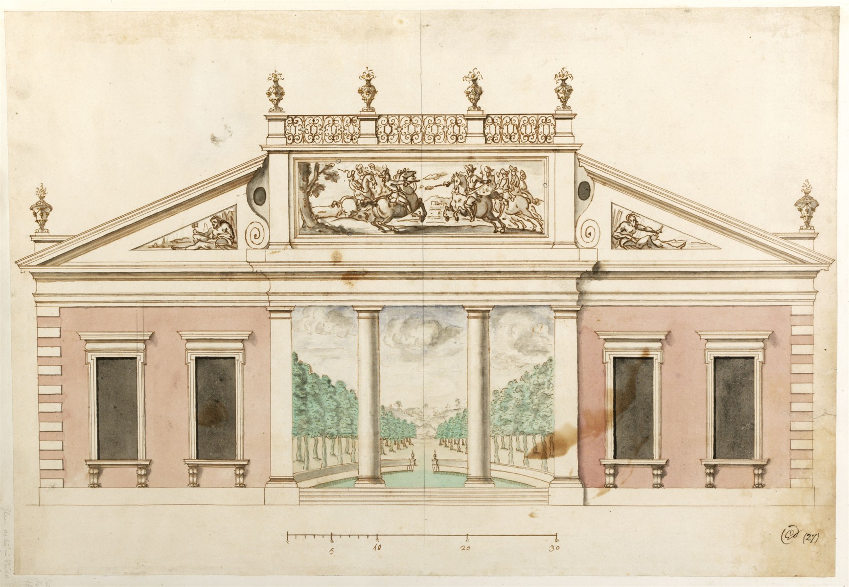 William Dickinson, Revised design for a pavilion on the bowling green, with perspective of vista through portico, 1700
