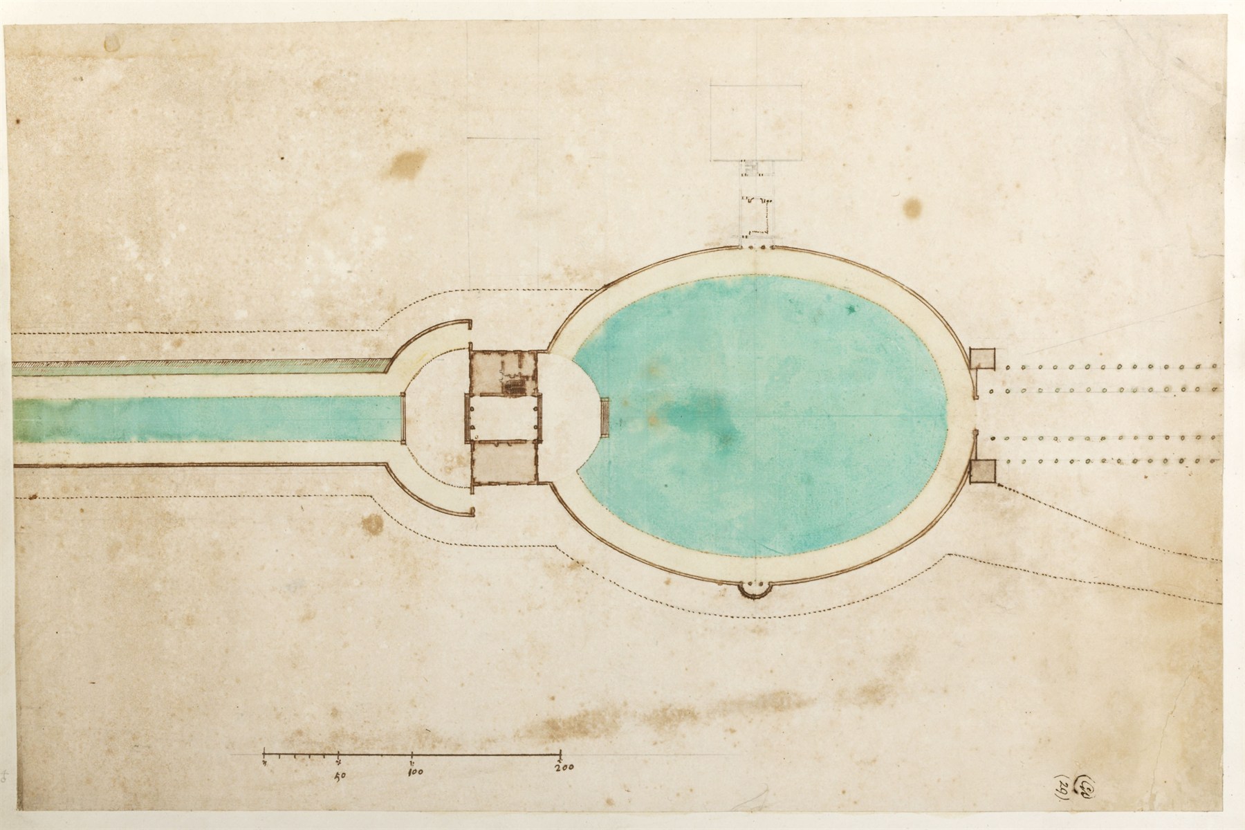 Soane also had one of Henry Wise’s presentation designs for the Maastricht garden at Windsor Castle. It only differs from the final scheme in details of planting in the lower rectangular lawn area and the absence of fountains in the central lake. The Maestricht Garden was a very large space on the north east side of the castle – 1722 metres long by 610 metres wide. In September 1713 Wise submitted an estimate of £6,874 ‘for levelling, new making and planting a division of ground on the North side of the Castle’ (Green, Henry Wise, p. 83) and work began soon afterwards. The project was abandoned the following year soon after the death of Queen Anne.