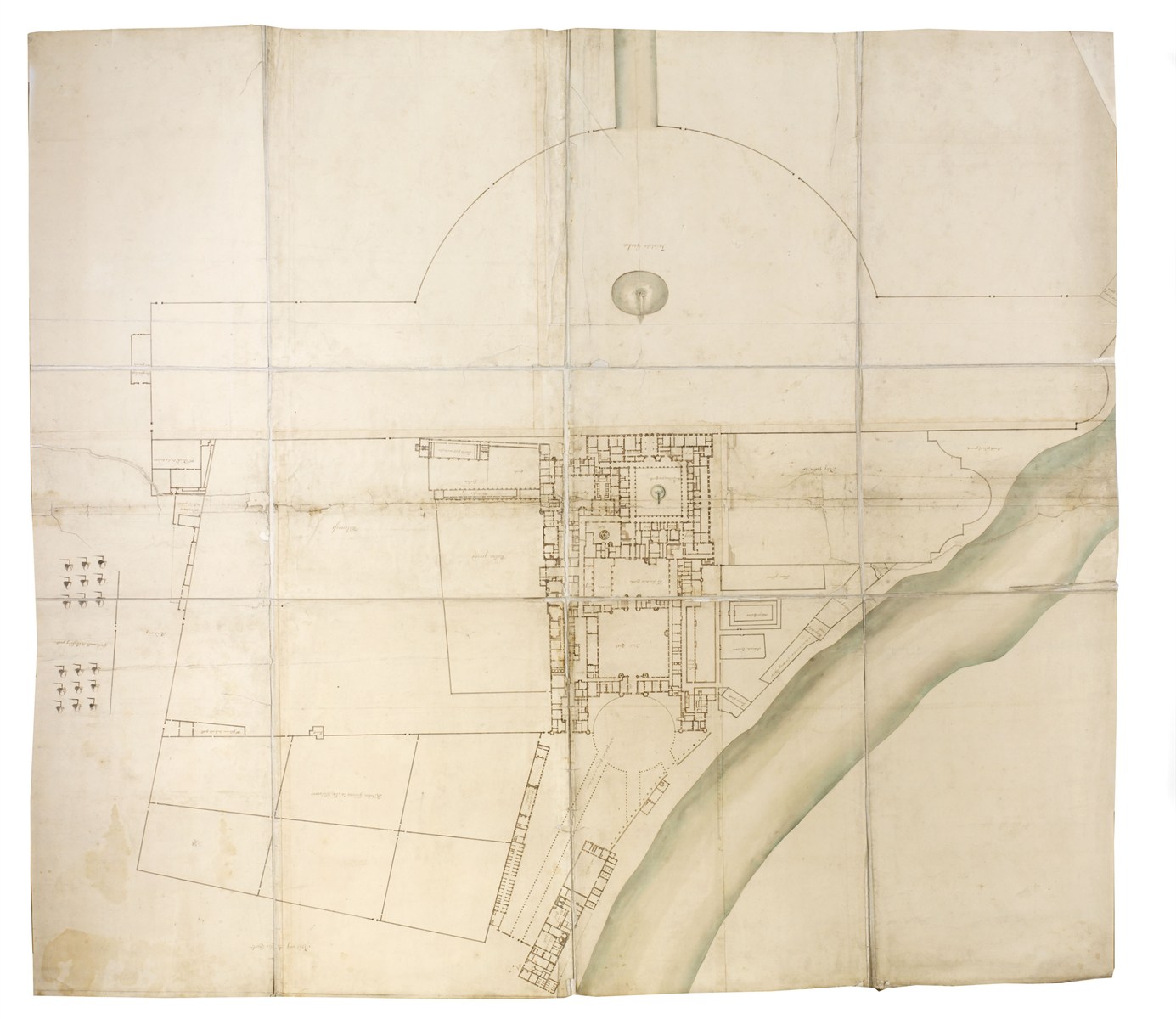Other Hampton Court drawings include a plan by the royal gardener, Henry Wise, of the palace and its grounds. This includes notes by Wise marking the location of various buildings & garden features including the Mellon ground; [Te]rris goeing [to the Bowlin]g Green; Bird houses, Vollery ground, Banqueting house, A Garden to the keeper of the privy lodgings, Foreign plants, Auricula Quarter, Orange Quarter, Flower garden, and Privy Garden.