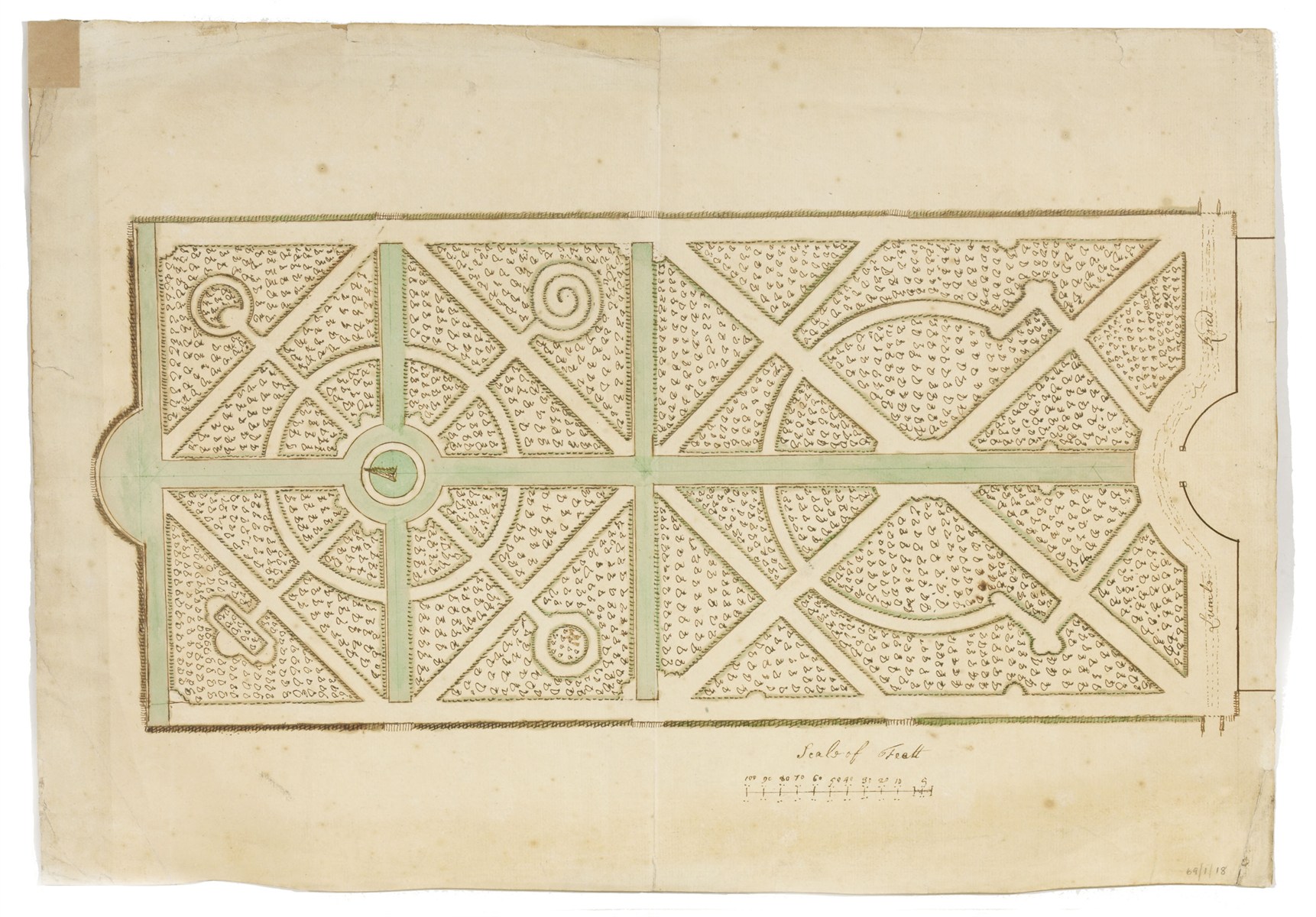 Perhaps Soane understood the importance of London and Wise to garden design because he had several other drawings by them. This design for a large, rectangular ‘wilderness’ garden, curved path in the centre is thought to have been for Lumley Castle in County Durham which London is known to have visited in 1699.