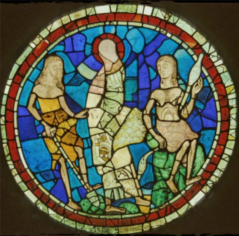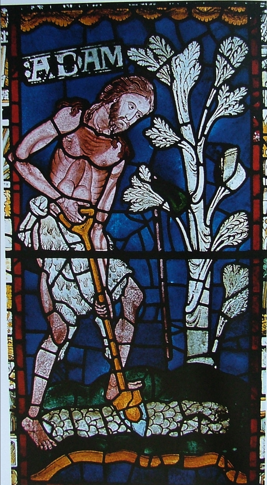 Adam had to be taught how to dig, and Eve how to spin and so an angel [usually said to be the Archangel Michael] was sent down to instruct them. Images of this were a popular subject in the Middle Ages and it was widely depicted in medieval manuscript illuminations, wall paintings and stained glass. A window in Lincoln cathedral depicts the angel demonstrating the art of digging, with one foot resting on a spade in the same manner as Adam, and again barefooted….