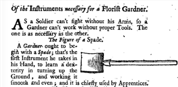 The spade was the gardener’s main tool. The French writer Louis Liger wrote: ‘As a soldier can’t fight without his arms, so a gardener can’t work without proper tools’, although he also suggests that the spade is ‘chiefly used by apprentices’. But by Liger’s time this heavy clumsy instrument has been improved by making the entire blade of plate iron. It was forged with iron straps that were bolted to the wooden handle. But this caused problems of a different sort because having an iron blade meant that the metal was going to cut into the gardeners foot as they dug. The solution was either to turn the sharp upper edge of the blade over to form a tread or to strap iron plates to the gardeners boots or clogs.