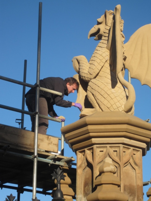 Last December the Knebworth House Education & Preservation Trust which now owns and runs the estate has replaced a pair of gryphons on the main entrance gates. The original figures, a much worn pair known as Mr and Mrs Clarence will be moved into new places to guard the tropical gardens shortly.