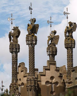 The revival of interest in mediaeval history and style that started with Sir Walter Scott’s novels soon shifted into architectural forms. One of the first places to reflect this was Knebworth in Hertfordshire. Bought by Sir Robert Lytton in 1490 it has been the home of his descendants ever since. In common with many of his contemporaries Sir Robert contributed to the Tudor building boom, and built himself a new, four-sided courtyard house attached to the existing 15thc gatehouse. This remained largely unaltered for over 300 years, but then, the Regency chatelaine, Elizabeth Bulwer-Lytton, decided the Tudor mansion was ‘old-fashioned and too large’. She had three sides of the quadrangle demolished, gothicized the remaining wing and added eight towers and battlements. Later, her son the novelist Edward Bulwer-Lytton added further embellishments. One of its most prominent features is a set of heraldic beasts on the roof., although there were never any, as far as I can tell, in the gardens.