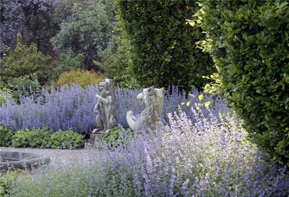 Heraldic beasts around the stone pond in the walled garden at Arley Hall