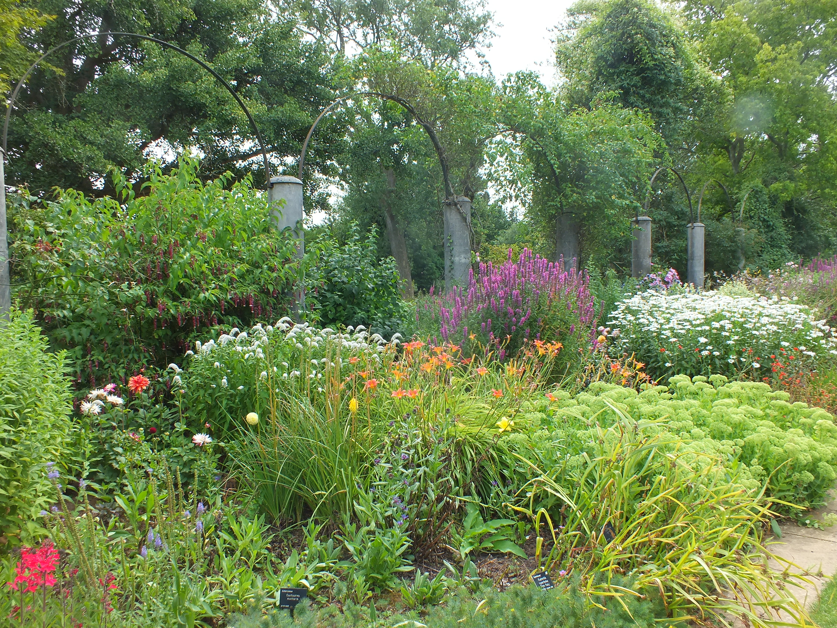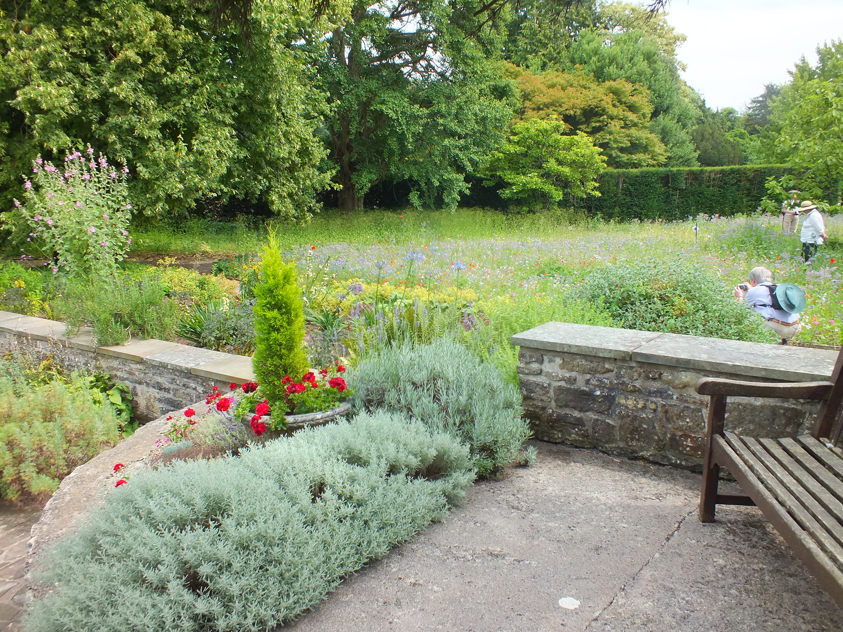 There is a newly created meadow garden before arriving at The Cloisters which is a quiet interlude with high yew hedging around a long gravelled space with benches and large pots. There are ‘windows’ cut into the yew to see through into neighbouring spaces. It lies to the east of the theatre garden.
