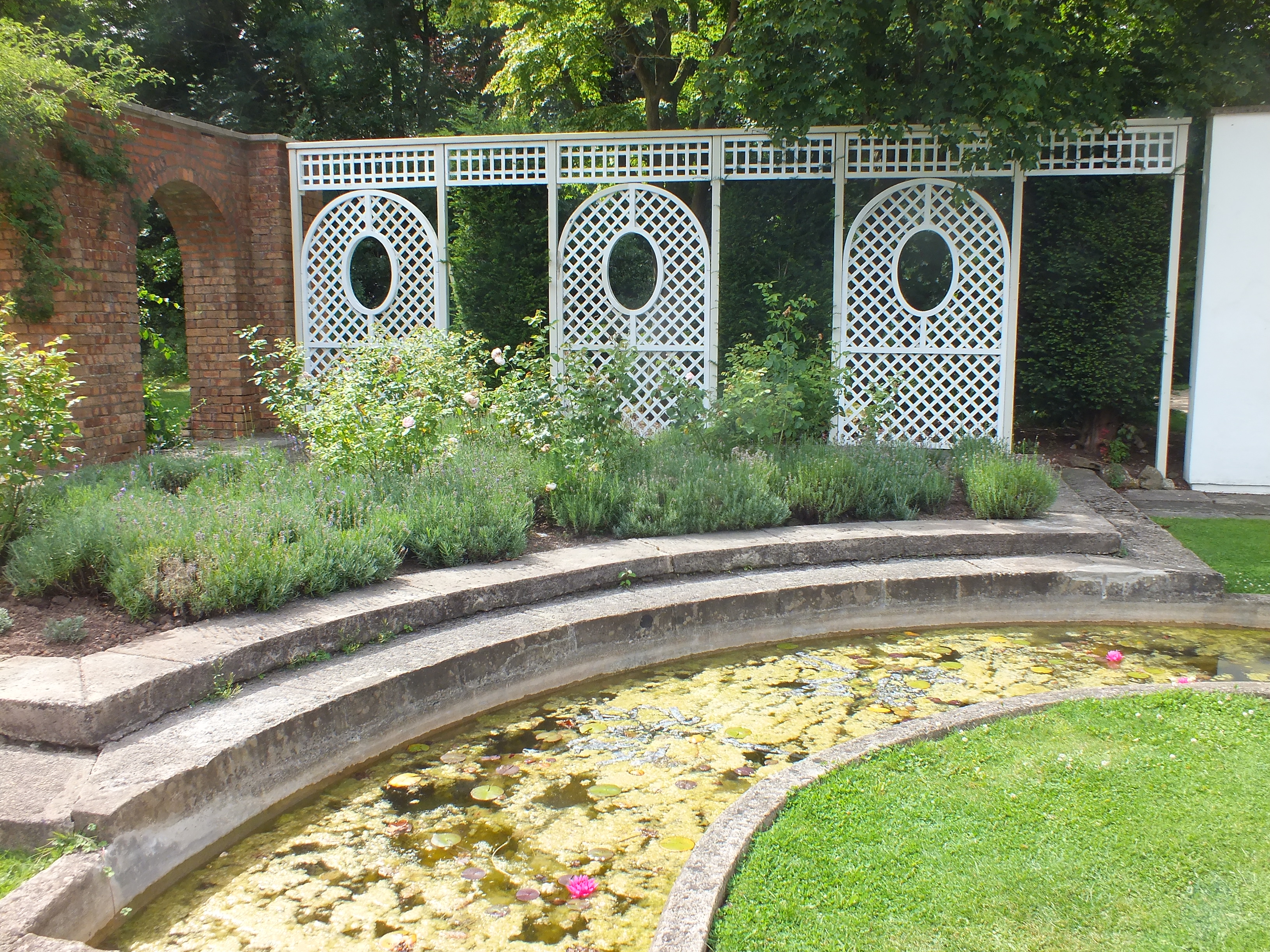 This has a very formal layout, with beds planted with lavender and small polyantha roses.The curving lily pools originally held some of Cory’s collection of Nymphaea. It is surrounded by elaborate arcading, some in trelliswork and other sections of concrete or brick.