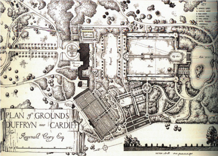 The collaboration on the gardens between Reginald and Mawson was a close one, and they discussed every aspect of the design together. Mawson wrote” Mr Reginald Cory is a typical example of the English enthusiasm for horticulture and arboriculture at its best…and an experimenter whose researches have greatly enriched our store of knowledge.” Mawson’s layout of the gardens is shown in a plan in his Art and Craft of Garden Making (1927).