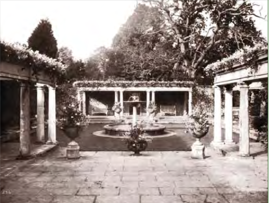Perhaps the grandest of all these small gardens is the Pompeian Garden built in 1909. Based on gardens discovered during the excavations of the destroyed city, it has a surrounding stone colonnade covered in wisteria, and backed by more yew hedging, a terminal pavilion and a central bird bath fountain. We are lucky enough to have not only another painting by Edith Adie but also a photo from 1915, only six years after it was completed.