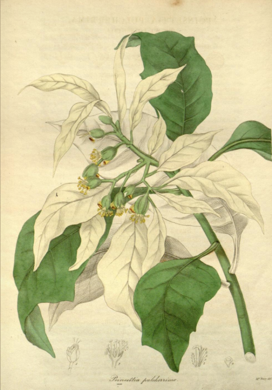 1774596-poinsettia-w-co-fThe Botanist also carried the first description and illustration of  the white bracted variety, which had “been found about 400 miles from Mexico city by William Bates who sent it to Charles Tayleure  of Toxteth Park, Liverpool”.1774596-poinsettia-w-co-f