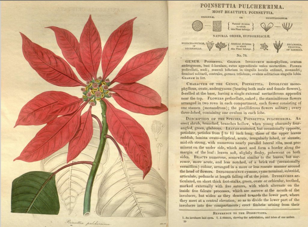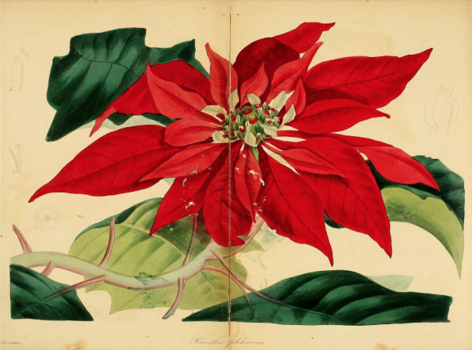 1774596-poinsettia-w-co-fThe following year, 1837, euphorbia pulcherrima made its appearance in Paxton’s Magazine of Botany as Poinsettia Pulcherrima.or Showy Poinsettia, where it merited a double page spread and was described as a “truly beautiful and very desirable stove plant… and nothing can exceed the ornamental effect they create.”  1774596-poinsettia-w-co-f