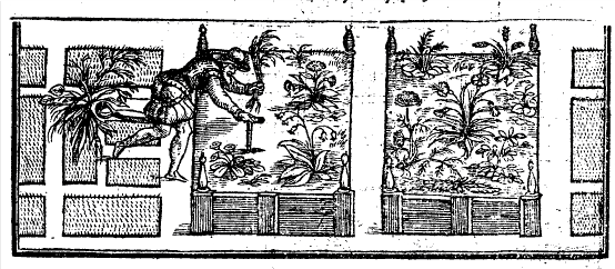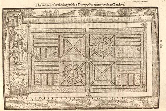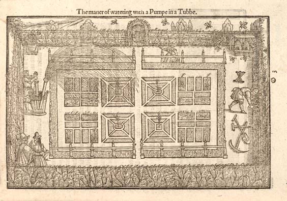 Another innovation that Hill records was also to do with watering. He includes an illustration showing the use of a pump to flood troughs in the garden. “There may be some water their gardens with great squirts made of tin… Draw up the water, set the squirt to the breast and force the water upwards so that the water in the breaking may fall as drops of rain upon the plants…”.