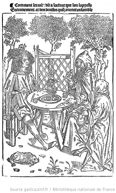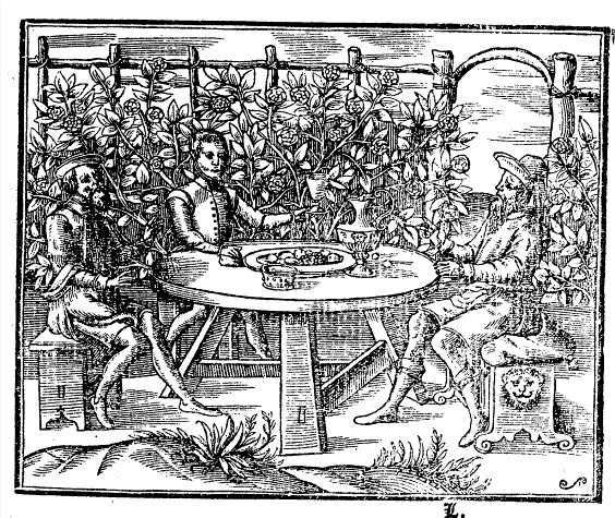 There is also a charming one of three men relaxing in an arbour, seated on benches at a three-legged table and surrounded by a splendid climber in full flower. Blanche Henry thinks that it is likely this was probably based on an illustration in a French text Le Chevalier Delibere by Olivier de la Marche.