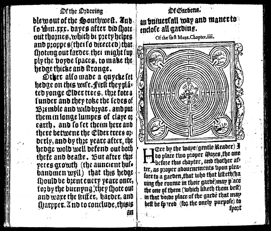Interspersed are two woodcut plans for mazes which are very similar to the ones drawn later by Androuet de Cerceau in his engravings of the Château at Gaillon. This had been built for the Cardinal d’Amboise, and was contemporary with Cardinal Wolsey’s Hampton Court. This might suggest that either Cerceau copied Hills design or much more likely there was an earlier image now lost which both writers had access to.