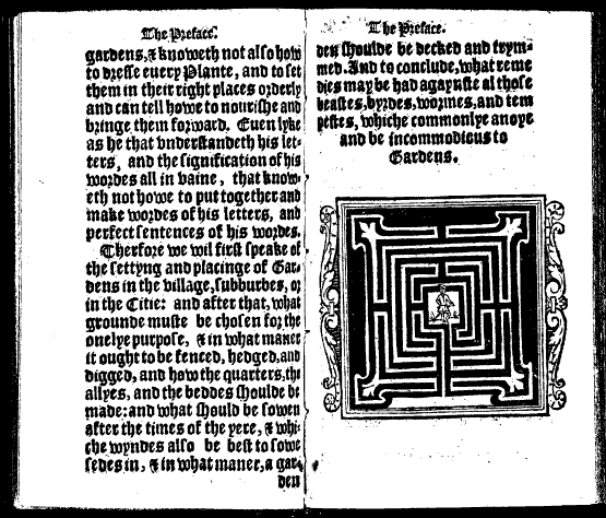 The title page contains a woodcut of a small formal garden. In the centre is what appears to be a central knot, surrounded by a series of geometric flower beds, crossed by narrow paths and enclosed by trellis panelling and columns. Outside that, and set against the outer boundary, are larger rectangular beds, an arbour, well and a pedimented gateway. Finally, surrounding all that is a paling fence either covered with creepers and climbers, or backed by a hedge. The view is probably drawn as if from a terrace outside the house.