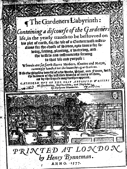 Hill died sometime in the mid-1570s and his second gardening book The gardeners labyrinth appeared posthumously in 1577. Published under the pseudonym of Didymus Mountain it was finished and published by his friend Henry Dethick. He dedicated the text, despite “its vulgar stile”, to Sir William Cecil, Elizabeth’s chief minister and himself an extremely keen and innovatory gardener.
