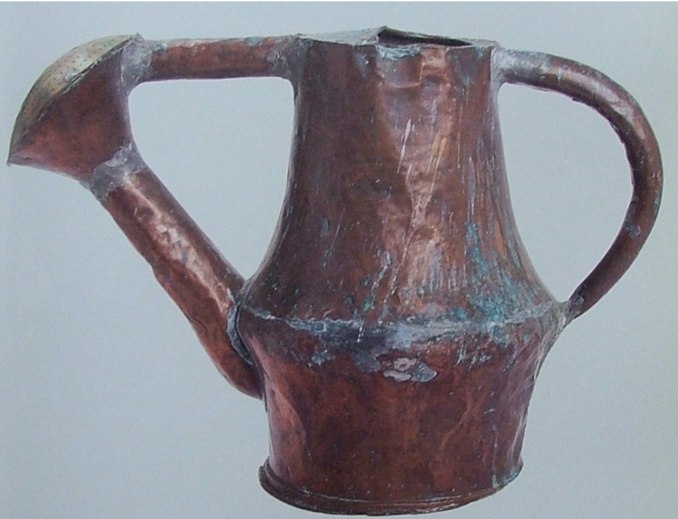 Watering pots were not new: “the common watering pot for the garden beddes with us, hath a narrow necke, bigge belly, somewhat large bottome, and is full of little holes, with a proper hole formed on the head, to take in the water, whiche filled full, and the thumbe laid on the whole to keep in the air, may on such wise be carried in handsome maner…”