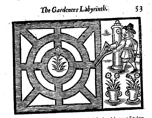 Surprisingly Hill’s books are not freely available on-line but there is a very nice edition of The Gardener’s Labyrinth edited by Richard Mabey, (Oxford, 1987) which has lots of other contemporary images to help elucidate the text. It is based on the 1651 edition, and leaves out Hill’s astrologically based notes on the medicinal uses of plants. However it does still include most of the original woodcuts and some new illustrations of mazes and gardeners working including another watering scene….