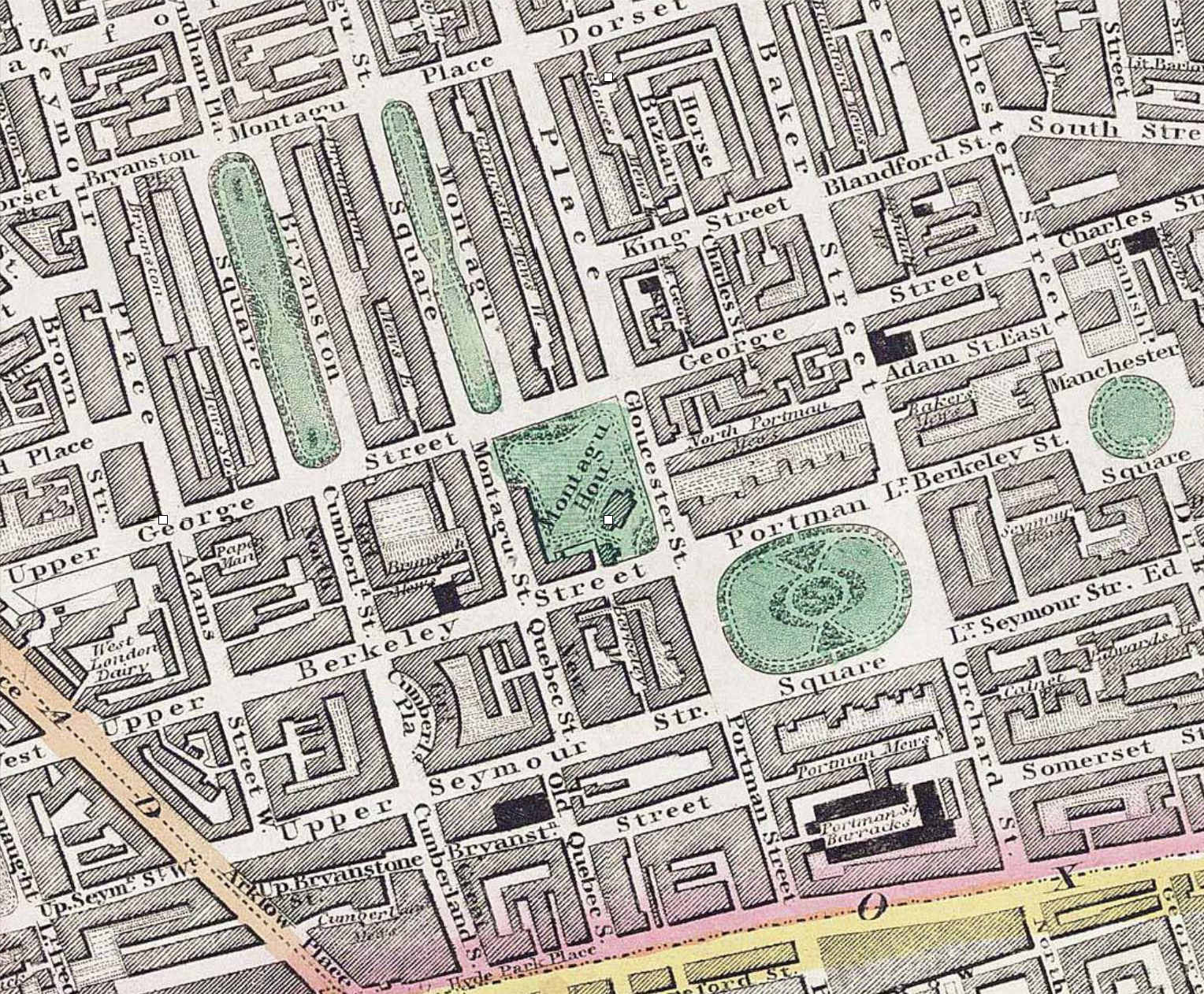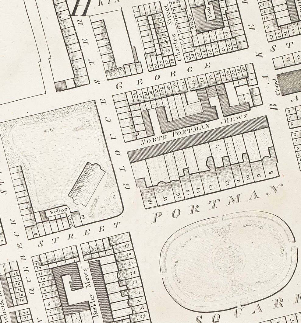 It was here too that she gave her annual chimney sweep boys parties, entertaining them with roast beef and plum pudding. One of them who later grew rich as a builder named Montagu Square and Montagu Place after her. Unfortunately the house was bombed in 1942 and the remnants demolished. The gate piers however were saved and are now at Kenwood. [London Encyclopedia, 3rd ed]