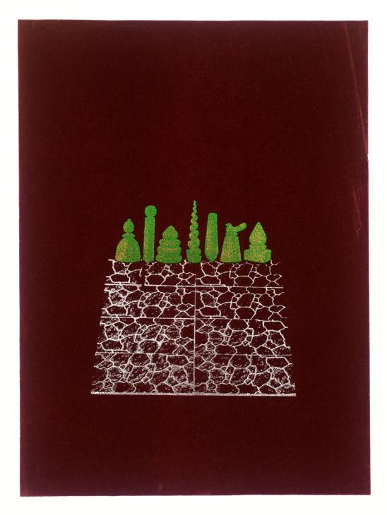 He experimented further with using flock in printing too. Open Gate is a relief print with cut out gate and shrubs made of flock superimposed on either side, whilst in For a Time and For a Season it is the arch which has been added.
