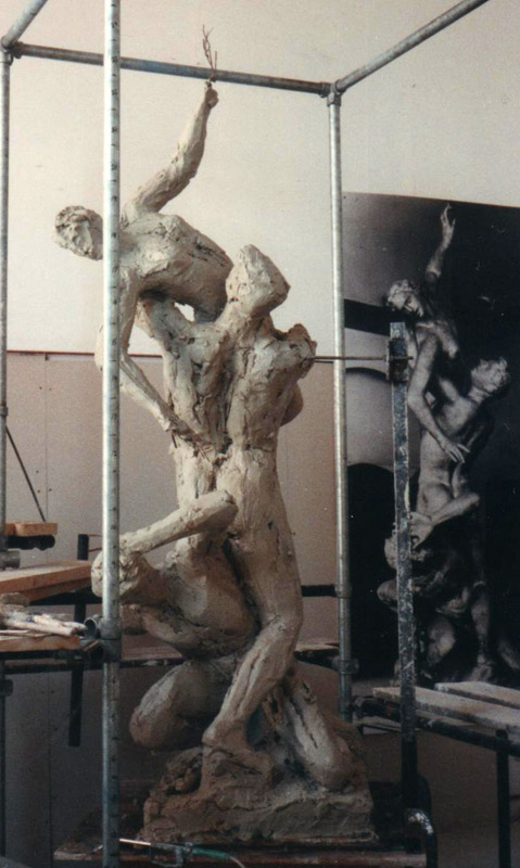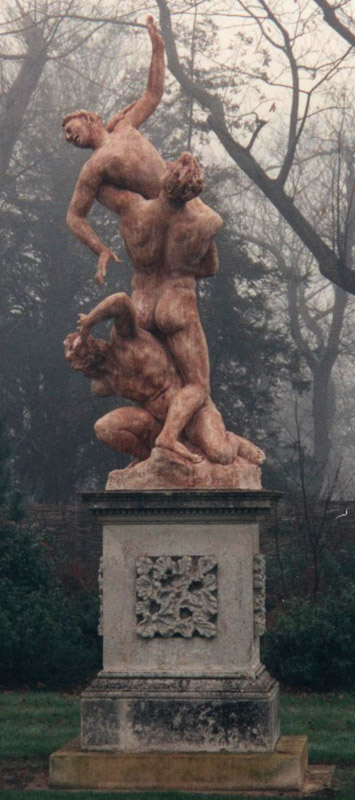 Ivor Abrahams is probably best known in garden-related circles for his work at Painshill where he was commissioned in 1998 to create a replacement for a lost copy of the Rape of the Sabines by Giambologna. This involved not just a trip to Florence to study the original in detail, but having scaffolding put up so that he and his wife could measure and photograph the piece properly. After building an armature, modelling in clay and making maquettes he felt that he still hadn’t got the whole thing right so he used two young dancers to try