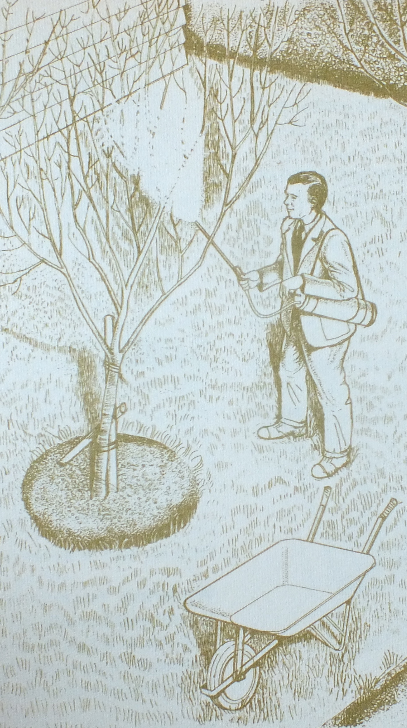 Percy spraying fruit trees in winter – and in his trademark jacket, tie and nice shoes from Percy Throwers Guide to Gardeners’ World