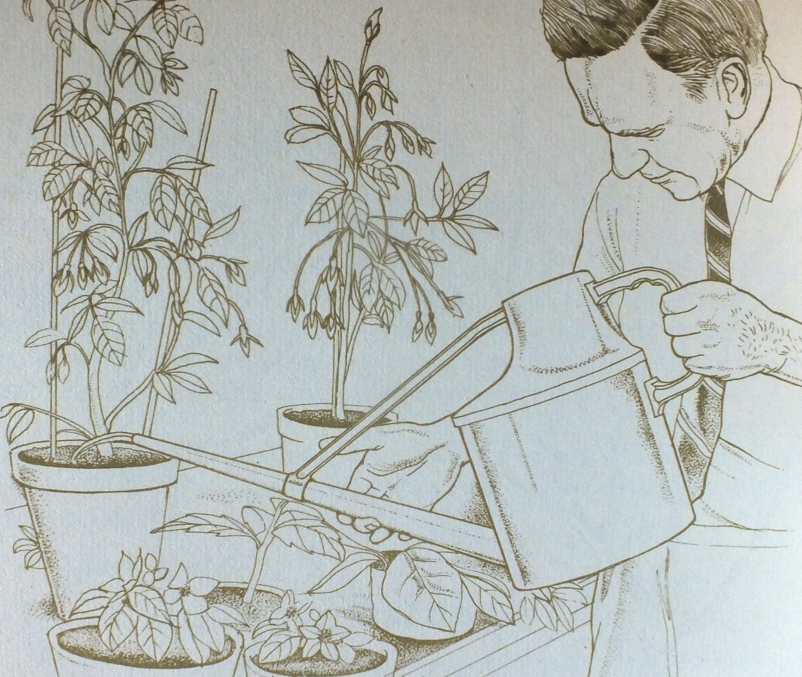 Percy watering in the greenhouse [and his shirtsleeves!] from Percy Throwers Guide to Gardeners’ World