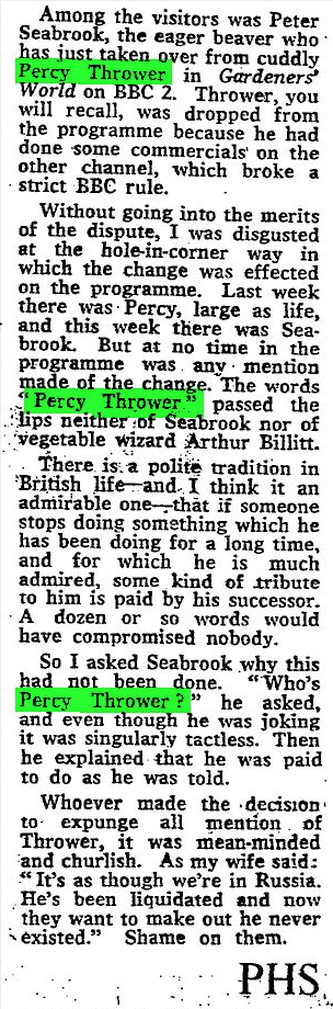 Peter Seabrook recalls after getting a phone call from Barry Edgar in Birmingham asking if he would take over Gardeners World at just a few days notice. “Percy had overstepped the mark. Yes, his face was alongside ICI garden products in all the shops and the ads and everything” but then “he recorded a couple of ads in his garden showing him applying Rose Plus … it was I’m afraid a step too far and so he was axed.”
