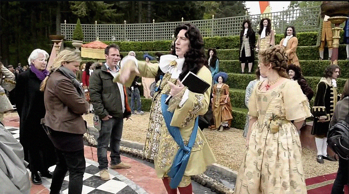 Louis and his brother, the delightfully camp Duc D’Orleans, arrive in the rain to inspect the mud and the mess and make menacing remarks about the fate of those who don’t fulfill the king’s wishes. Of course Le Notre promises that Sabine’s ideas will work. When you read the logistical background to the scene it is very funny. Rickman reports that: “it’s pissing with rain. And you’ve got to shoot, and it’s outside, and it’s a scene with Louis, who would look out of the windows and say ‘I’m not going out in that’! [Laughs] I am Louis! I do not go out in the rain!” So you thank god for the fact that James Merifield [production designer] has made a shitty old piece of canvas canopy to protect the workers. And I said to them we could pull the canopy over, and Louis could stand under that! Lo and behold it’s in the film, with four poor sods holding these poles, getting drenched. There are holes in the canvas, the rain is dripping through, but nevertheless, Louis is standing under it. And we shot the scene with the pouring, pouring rain all around us. But at least Louis didn’t get wet!”