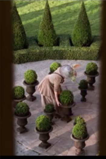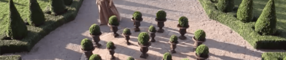 We meet the ruggedly handsome long haired Andre in the office of his improbably grand chateau home. A series of middle aged men in wigs are ushered in one by one to present their plans. During an interval Le Notre looks out of the window to see Kate Winslett in a flamboyantly feathered hat slightly re-arranging the array of pots in the courtyard underneath his window…. moving one slightly off-centre to ruin the symmetry.