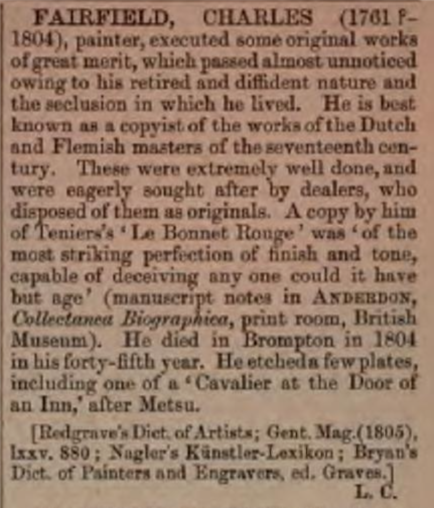 Indeed he was: almost the stereotypical impoverished painter living almost hand to mouth. The original Dictionary of National Biography talks of his “great merit” but despite this, as his obituary in the Gentleman’s Magazine of 1805 noted: “he was never in easy circumstances, and for a great part of his laborious life was under the clutches of the griping and unconscientious picture-dealer, who gathered the fruits of his labours by practising deceits upon the world”.