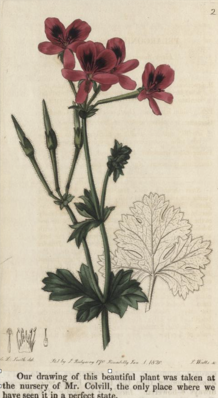 The Geraniaciae, or geranium family includes several genera, notably Geranium [the cranesbills], pelargoniums [which confusingly are still commonly called geraniums], and erodiums. Pelargoniums are indigenous to South Africa and, although a few species had reached western Europe because of the Dutch settlement at Cape Town, pelargoniums remained largely uncollected and unknown until the very late 18thc. So in 1795, despite the fact that most species propagate really easily, they were still rare and so highly prized and collectible – and thus, of course, very expensive.