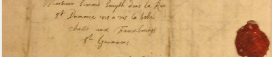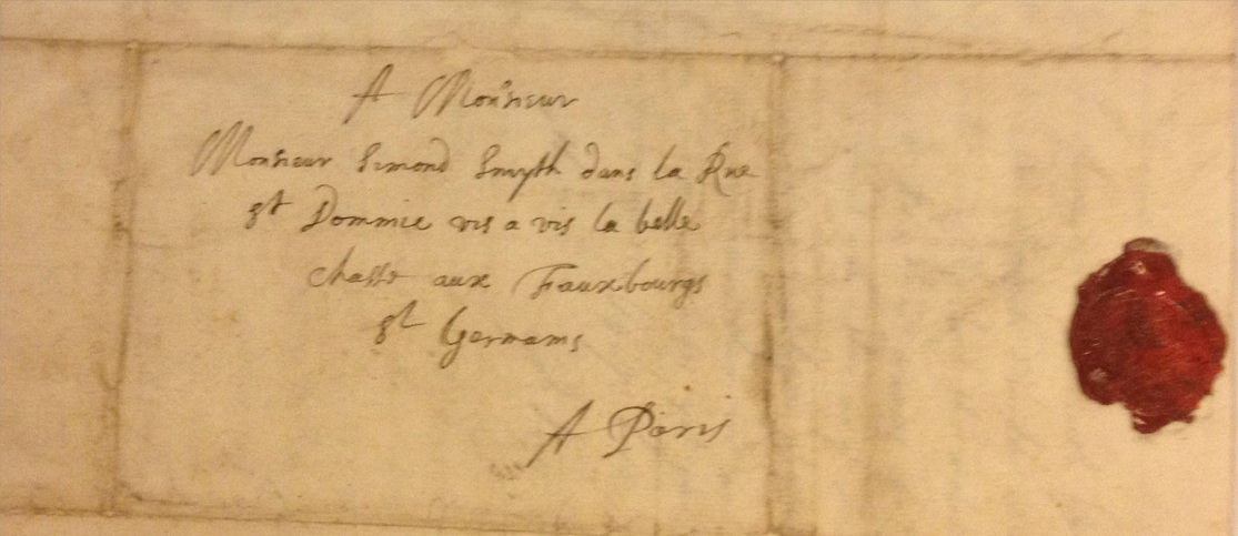 The letter was sent to Monsieur Simond Smyth at a house opposite La Belle Chasse [which I presume was an inn] in the Rue St Dominic in the Faubourg St Germain in Paris. The faubourg [or suburb] was just beginning to become the favorite home of the French nobility with many grand mansions being built in the new streets across the former open fields outside the city walls.