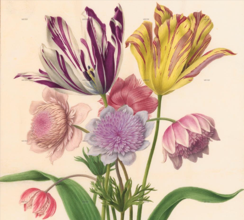 Details of tulips and anemones from Les Velins du Roi by Nicolas Robert, Museum of Natural History, Paris
