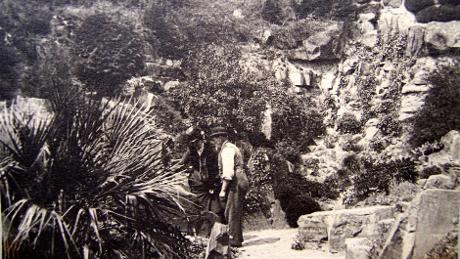 where steep steps climb the rocky banks to the upper parts of the garden. This is a very sheltered area, although the gardeners are still taking no chances with their tree ferns.