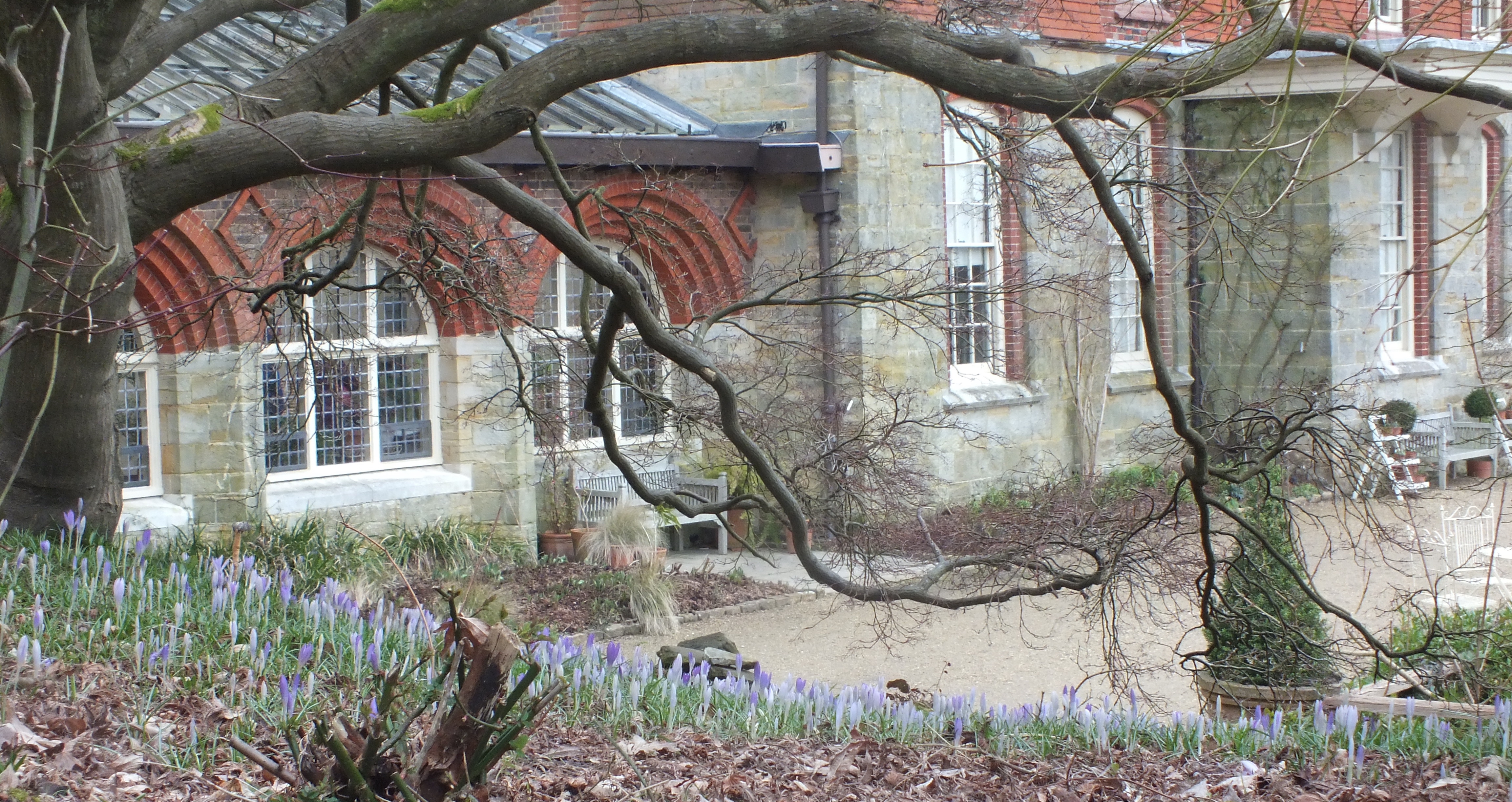 From the top of the Quarry Garden there are views back to the house and across the valley. The path then leads past the Sloping Lawn, which is planted with naturalised bulbs as recommended by Robinson, to the Top Terrace. These areas can also be accessed by more gentle paths from the other corner of the main house Terrace. The Top Terrace and its summerhouse was designed by Cheal & Sons in 1910 and is rustically formal, if that isn’t a contradiction in terms. On the north side is a woodland shelter belt, replanted after the devastation of Great Storm of 1987, and there are wide views across the valley to the south. The whole area is being rejuvenated as part of the Standen Revival project.