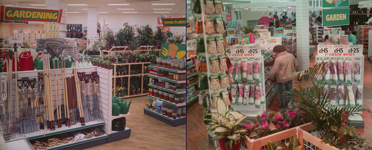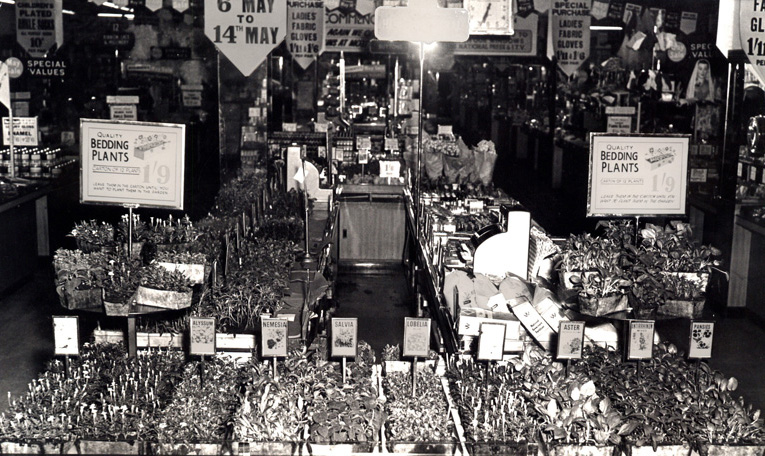 From 1976, where space allowed, back yards of the largest stores were converted to outdoor Garden Centres, where the selection of growing plants could be displayed to advantage. The natural light and ease of watering also helped to extend the shelf life of the shrubs and blooms.