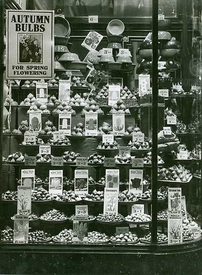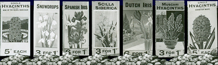 hg-AutumnBulbsWindowBefore World War II bulbs and shrubs were sold loose rather than in packs. Bulbs like daffodils and tulips were one old penny each (½p), rosebuds (grafted small twigs of rose bush) were three pence (1.25p) and hybrid bulbs like prepared hyacinths were five pence (2p) each.  Tiny bulbs like crocuses and muscari were three for a penny (7 for 1p).