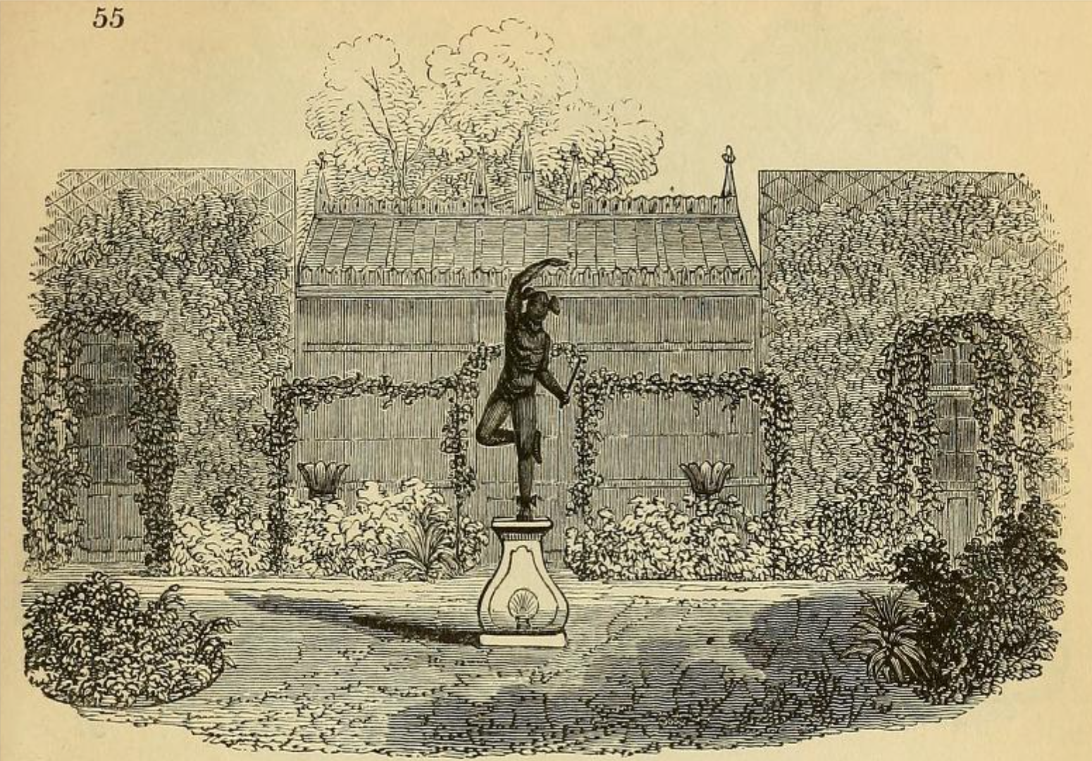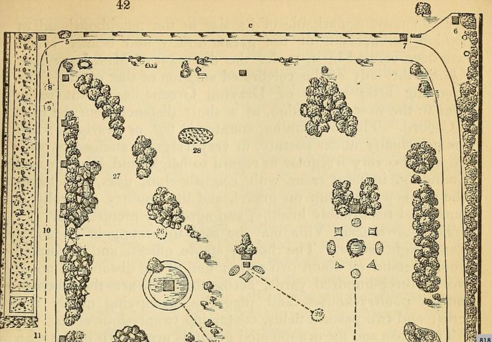 Loudon then describes the garden for his readers. “The decorated ground…is remarkable for the great variety which it contains in a very limited space; and the secret of producing this variety consists in introducing numerous small groups of trees and shrubs, sometimes combined with flowers or climbers, at other times with rockwork and with statues, fountains, basketwork and so on.”