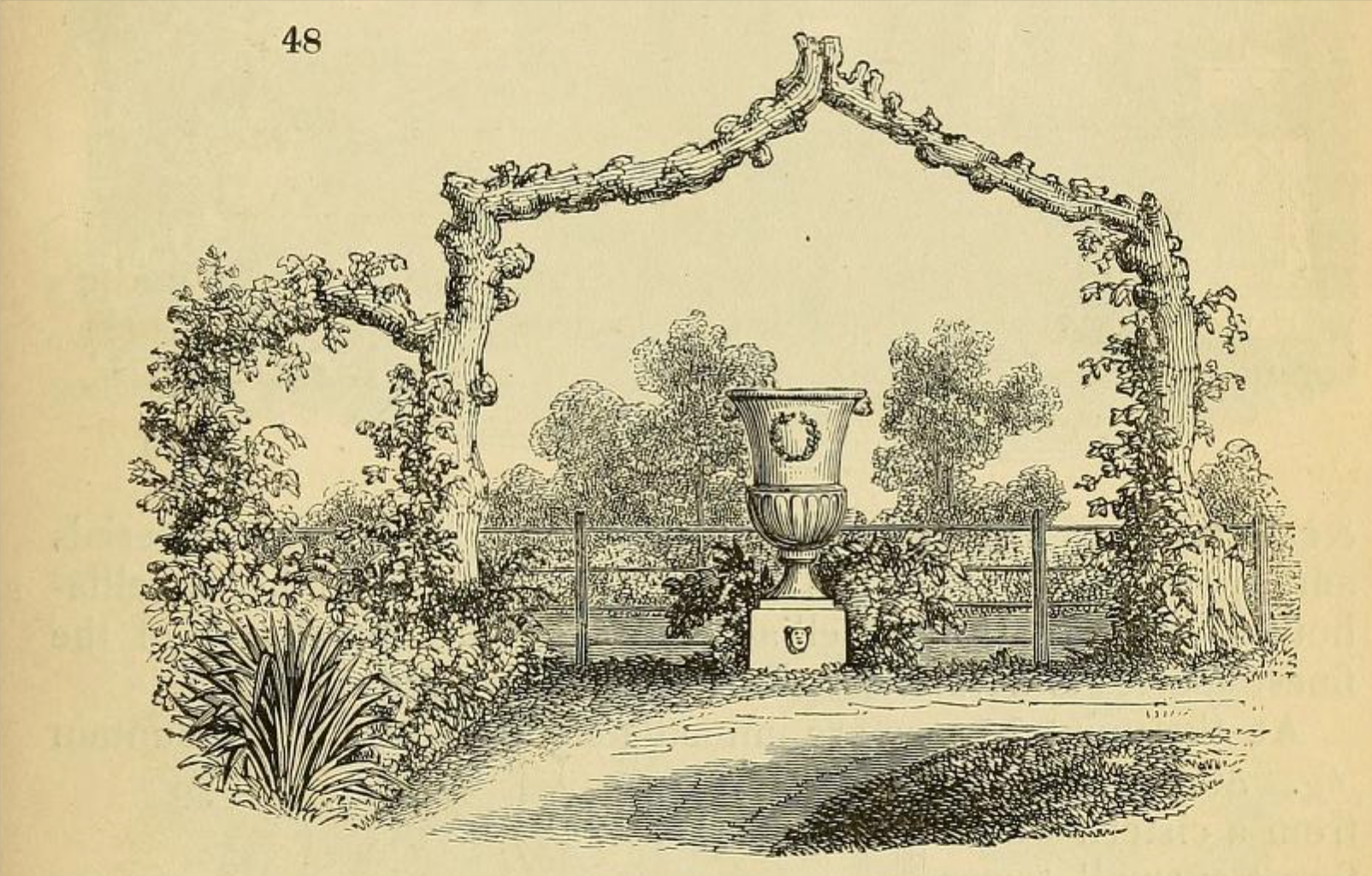 Loudon’s “next scene of interest” was the statue-lined Italian walk [point 8 on the plan] which had another vase this time framed by a rustic arch at the boundary and led back towards the house and a view of “a span-roofed” greenhouse.