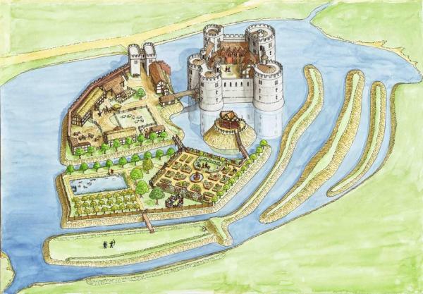 Until quite recently the mount was thought either to be have been a feature of the castle’s defence system or perhaps like most other known mounts, built later in the 16th or 17th century. However, archeological surveys carried out by English Heritage in 2002 found the complete design of a 14th century enclosed garden preserved under turf in the outer bailey. The geophysics revealed that the mound was surrounded by paths, flower beds and water-filled ditches, and was probably topped by a ‘gloriette’ or summer house. The Director of the site investigation Peter Brown explained: “The lines of paths and rectangular plot-like features of the medieval garden are shown on the survey leading towards the mount. They are not aligned with the rest of the garden area, as might be expected. This garden was clearly meant to be viewed from the top of the mount.”