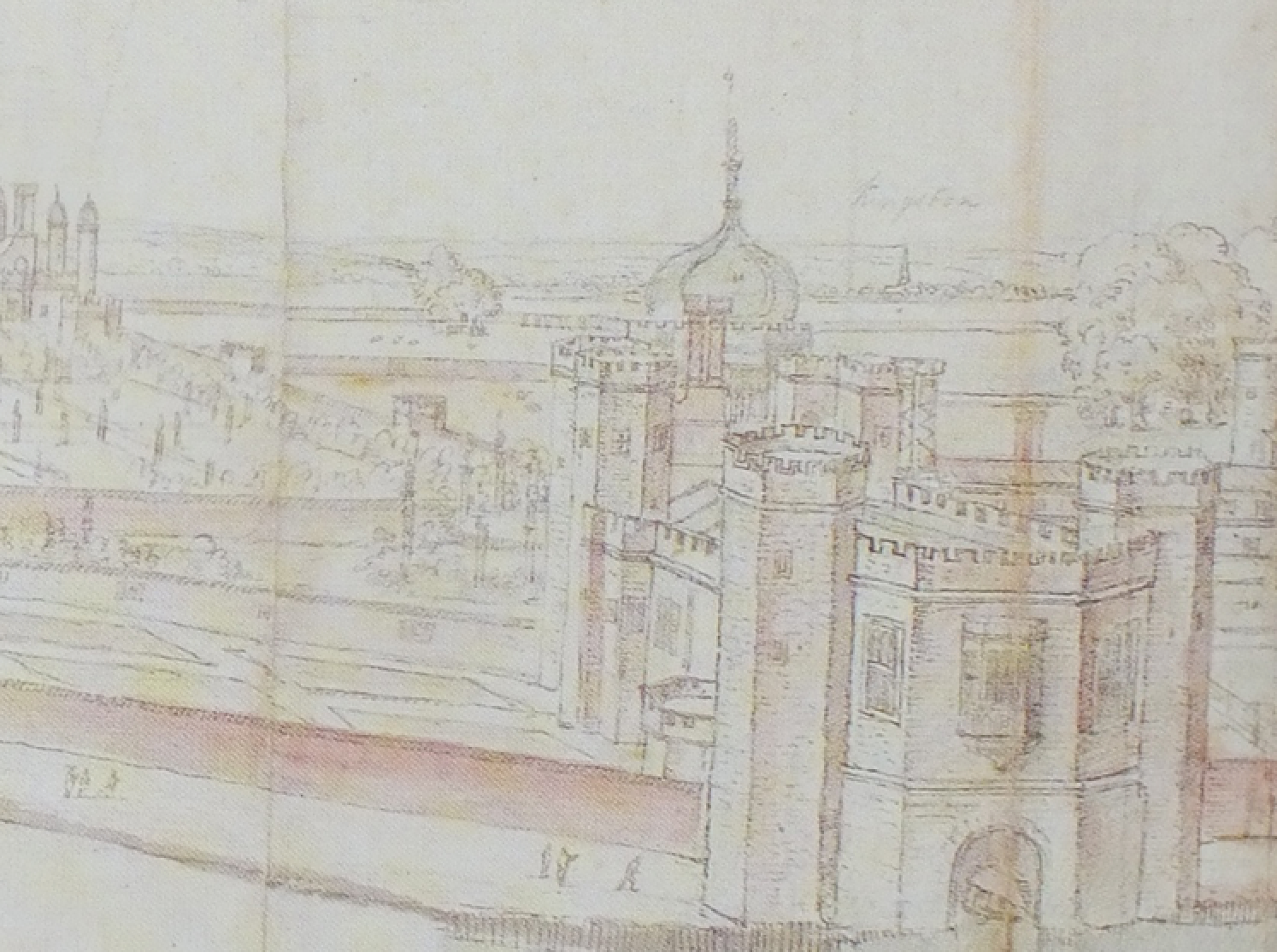Apparently made from more than 250,000 bricks it was topped by a 3 floored banqueting house, the Great Round Arbour, which had the bulbous roof hiding behind other buildings.