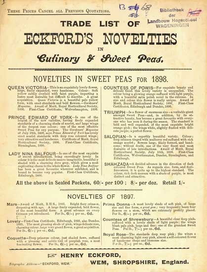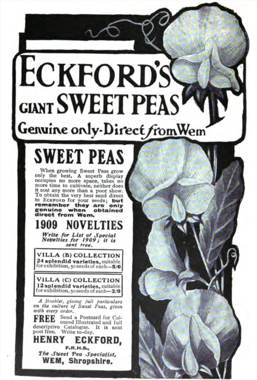After Eckford’s death his son John Stainer Eckford (1864–1944) carried on the seed business at Wem, but the task of championing sweet peas and raising new varieties fell largely on the Unwin family who are still one of the leading growers. For more on them see Colin Hambidge, The Unwins Century, 2003 and Charles Unwin, Sweet Peas: Their History, Development & Culture, first edition 1926, 4th edition 1986.