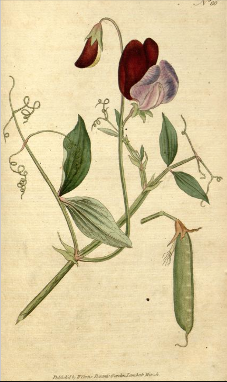 The original form appeared in Curtis’s Botanical Magazine in 1788 with the notes accompanying the plate saying “there is scarcely a plant more generally cultivated than the Sweet Pea, and no wonder, since with the most delicate blossoms it unites an agreeable fragrance.” This is in spite of the fact that general cultivation still only extended to the two other sorts listed by Miller.