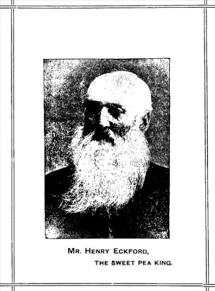 Regarded as the father of the sweet pea, Henry Eckford “found the Sweet Pea little known and as little valued, and transformed it into that glorious annual which is now found in almost every British garden” an expert breeder wrote of his achievement (Unwin, 1986, p4). In honour of Henry Eckford the Eckford Sweet Pea Society of Wem holds each year in July a sweet pea show which has a section for old fashioned varieties, always including many bred by Henry himself.