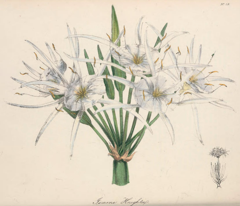 In the 1830s Joseph also sent his nephew Henry Knight to collect plants in Florida and Alabama [Desmond p.406] which led to the introduction of Ismene knightii [Floral Cabinet v2 1838] . The plate was drawn from the specimen growing in Knight’s nursery. Indeed plants in Knight’s nursery were often used as the exemplars in botanical magazines.