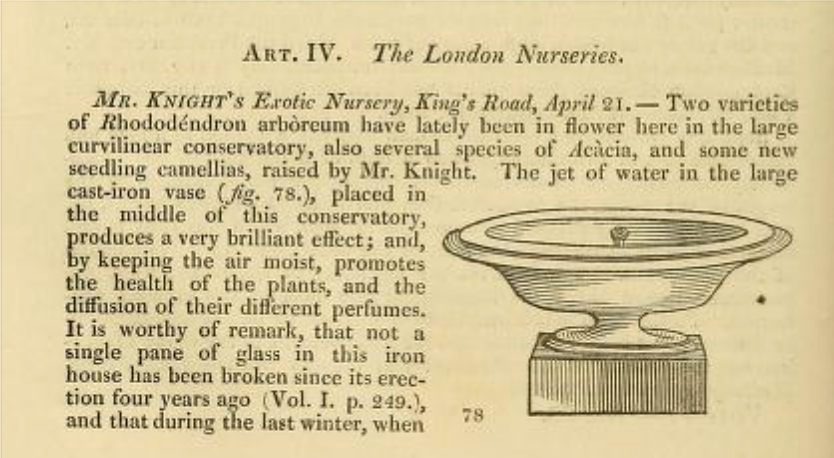 Back to Knight… The Chelsea nursery proved a great success and was regularly reported on by Loudon in The Gardener’s Magazine. The range of plants he offered was described as “rich and superiorly managed” in 1828, and by 1829 he had erected “a splendid conservatory” using the iron sah bar construction which was Loudon’s own invention. There is a very detailed account of the following year which can be found at:
